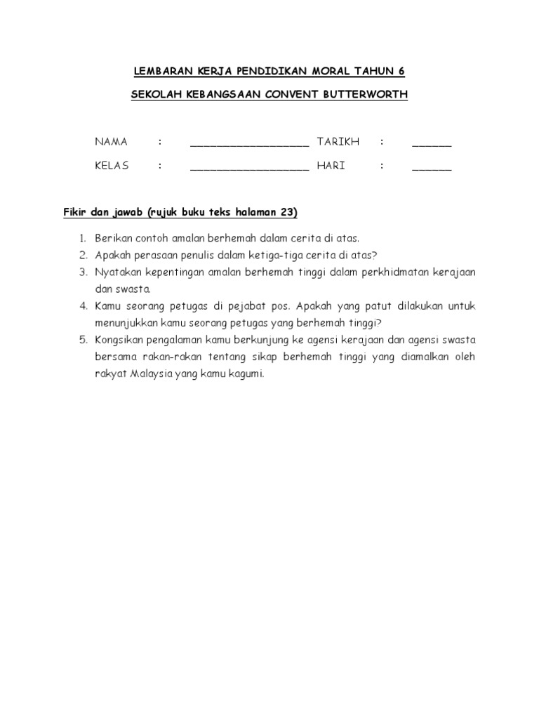 Lembaran Kerja Pendidikan Moral Tahun 1 Kerajinan Original Title. Lembaran Kerja Pendidikan Moral tahun 1 Kerajinan Uploaded by aliasothman Description. BUKU KERJALATIHAN LEMBARAN KENDIRI PBD PENDIDIKAN MORAL TAHUN 6 2022 RM 790 BUKU KERJALATIHAN LEMBARAN KENDIRI PBD PENDIDIKAN MORAL TAHUN 6 2022 In.